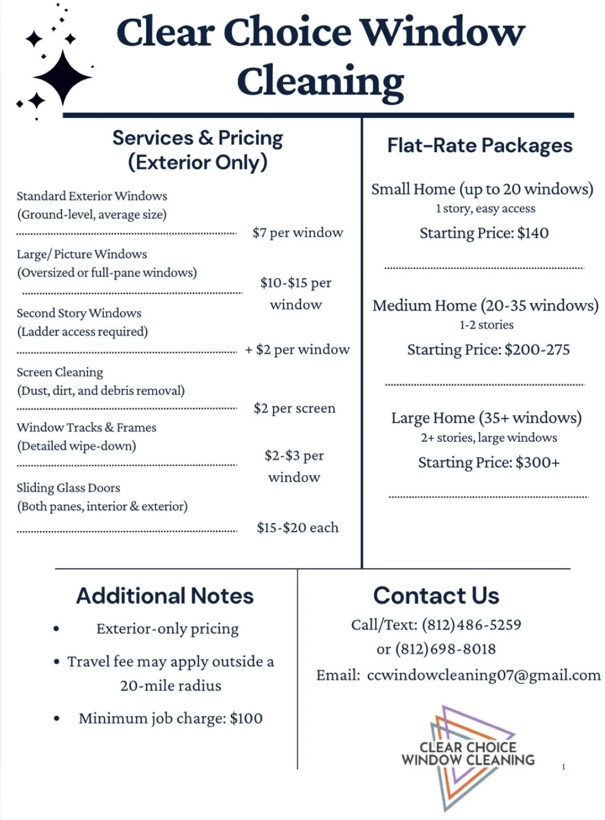 Clear Choice Window Cleaning delivers streak-free, reliable exterior window cleaning for homes and businesses. We keep your property looking sharp with simple, transparent pricing and professional results every time. Check out our full-service list and price sheet below and pick what fits your place.
